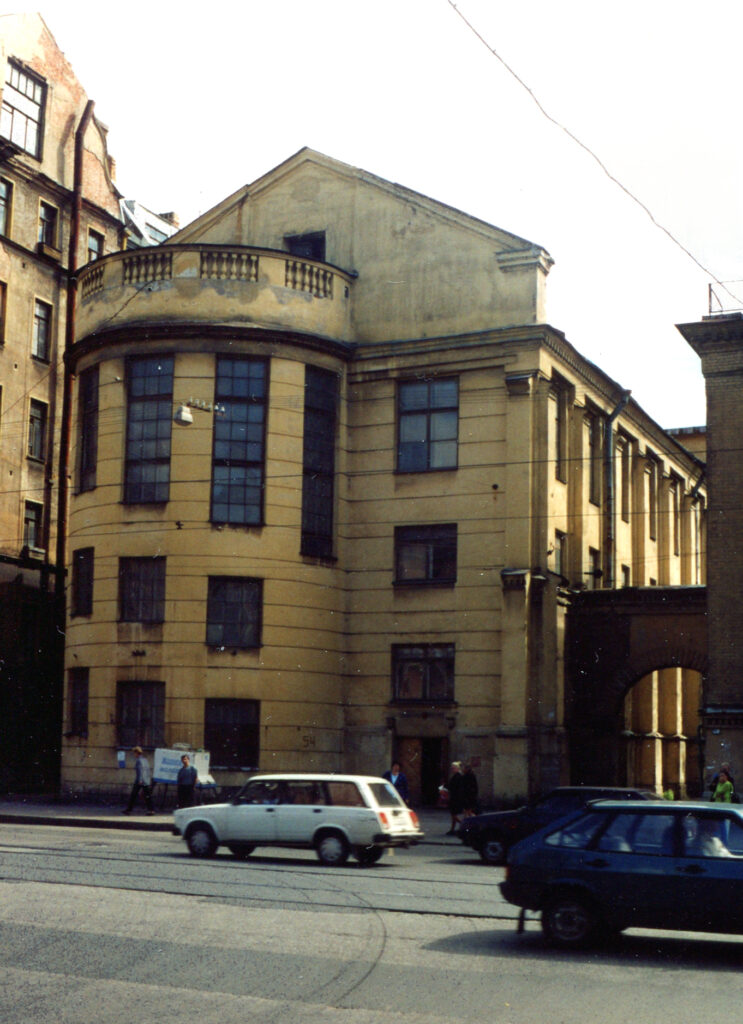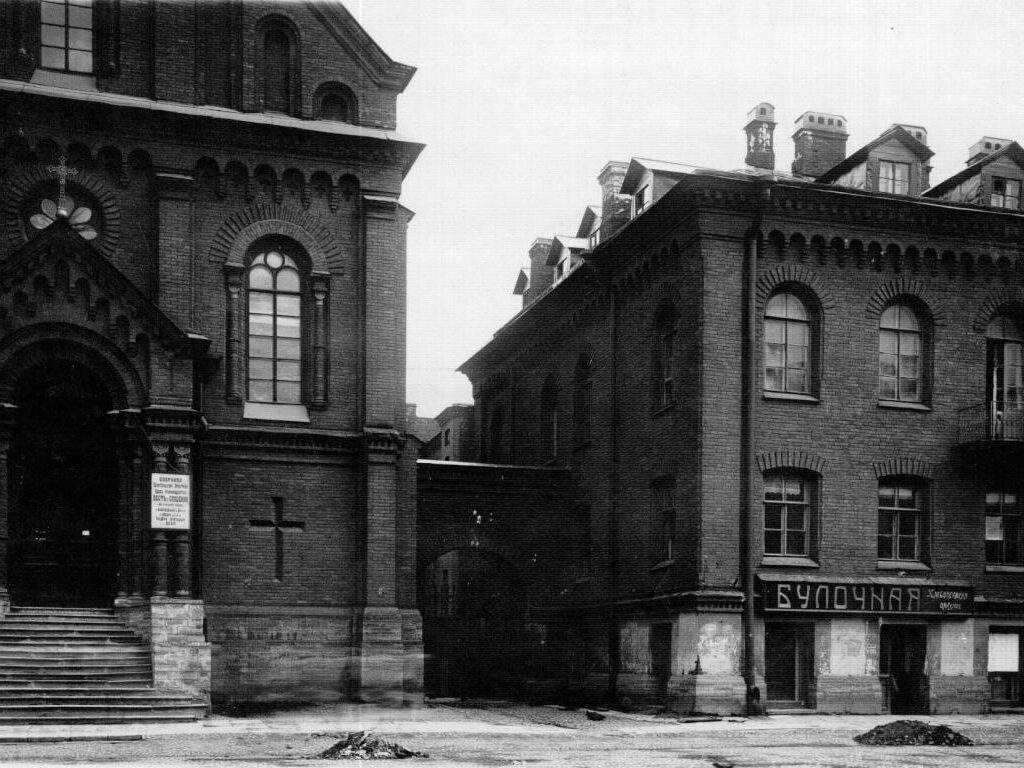 Церковное здание на Офицерской улице было заложено 24 июня 1859 года, на 800 мест (проект — архитектор Г. А. Боссе, строительство — архитектор К. К. Циглер фон Шафгаузен), освящено 27 ноября 1860 года. Здание было построено в псевдороманском стиле. Церковь имела большую шатровую колокольню. Для строительства была выделена значительна сумма из казны, остальное собрали сами прихожане, наибольшую активность среди которых проявляли барон Е. Ф. Мейендорф и лейб-медик Шольц. Всего расходы на здание составили 65 тысяч рублей серебром.